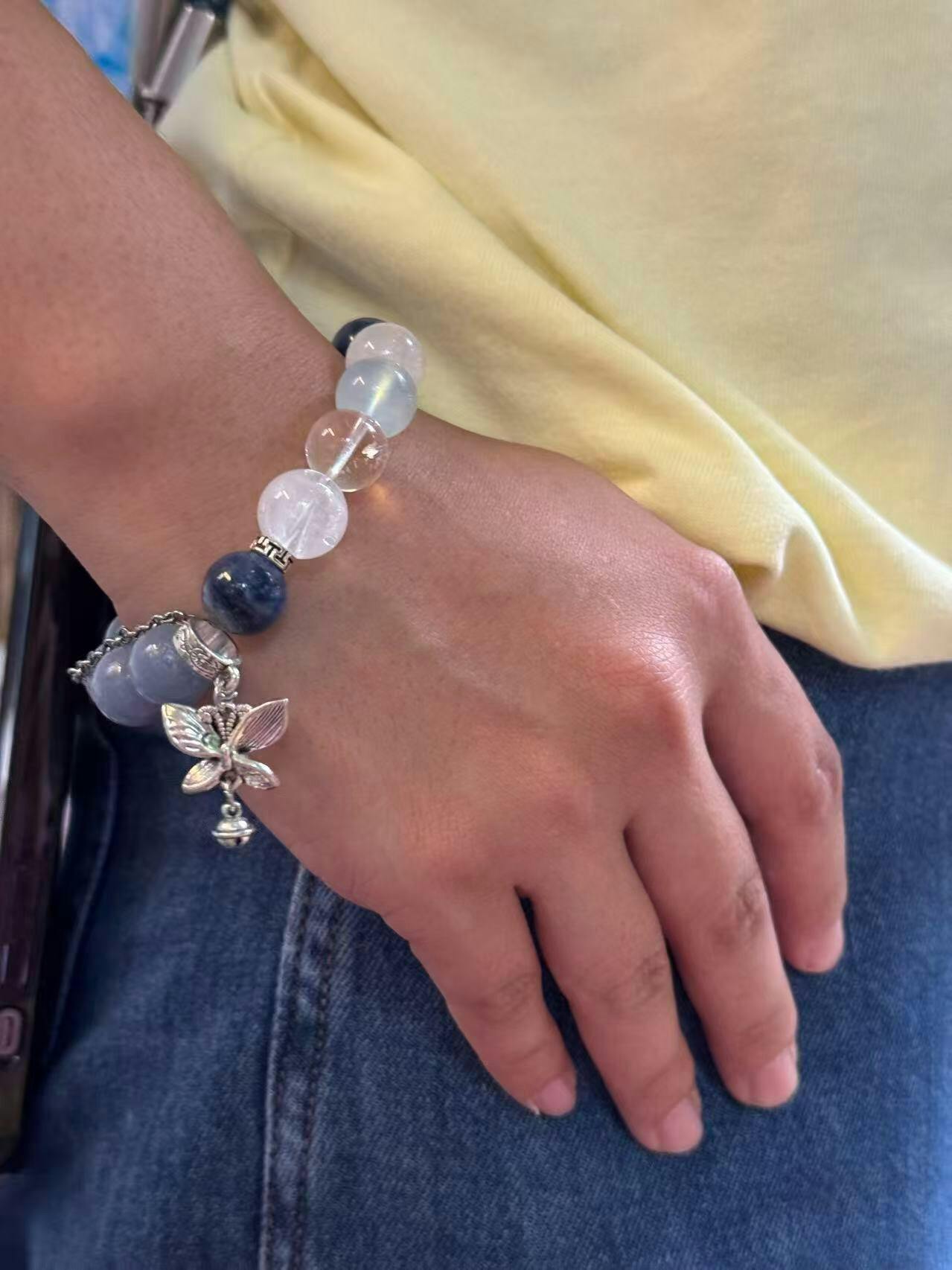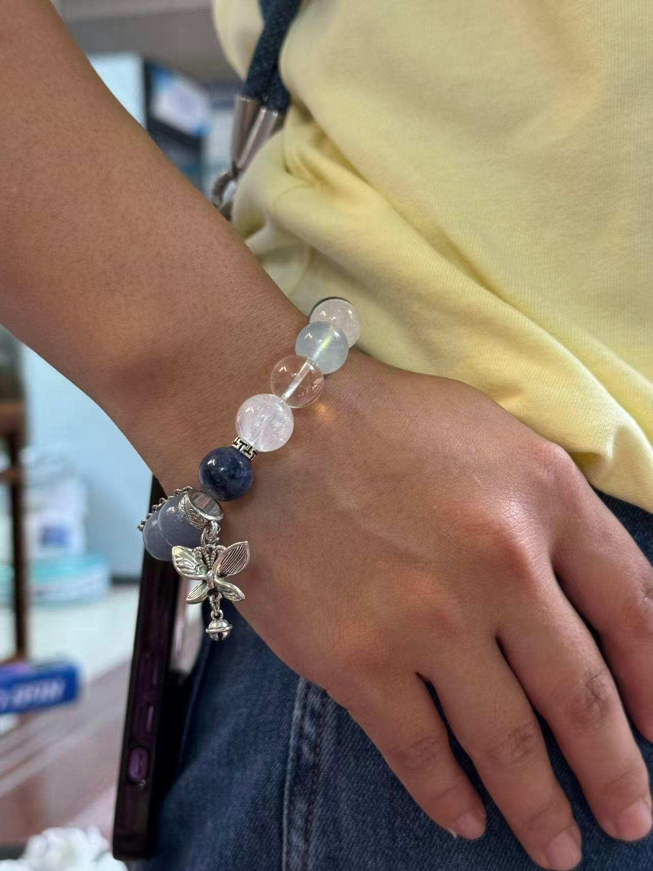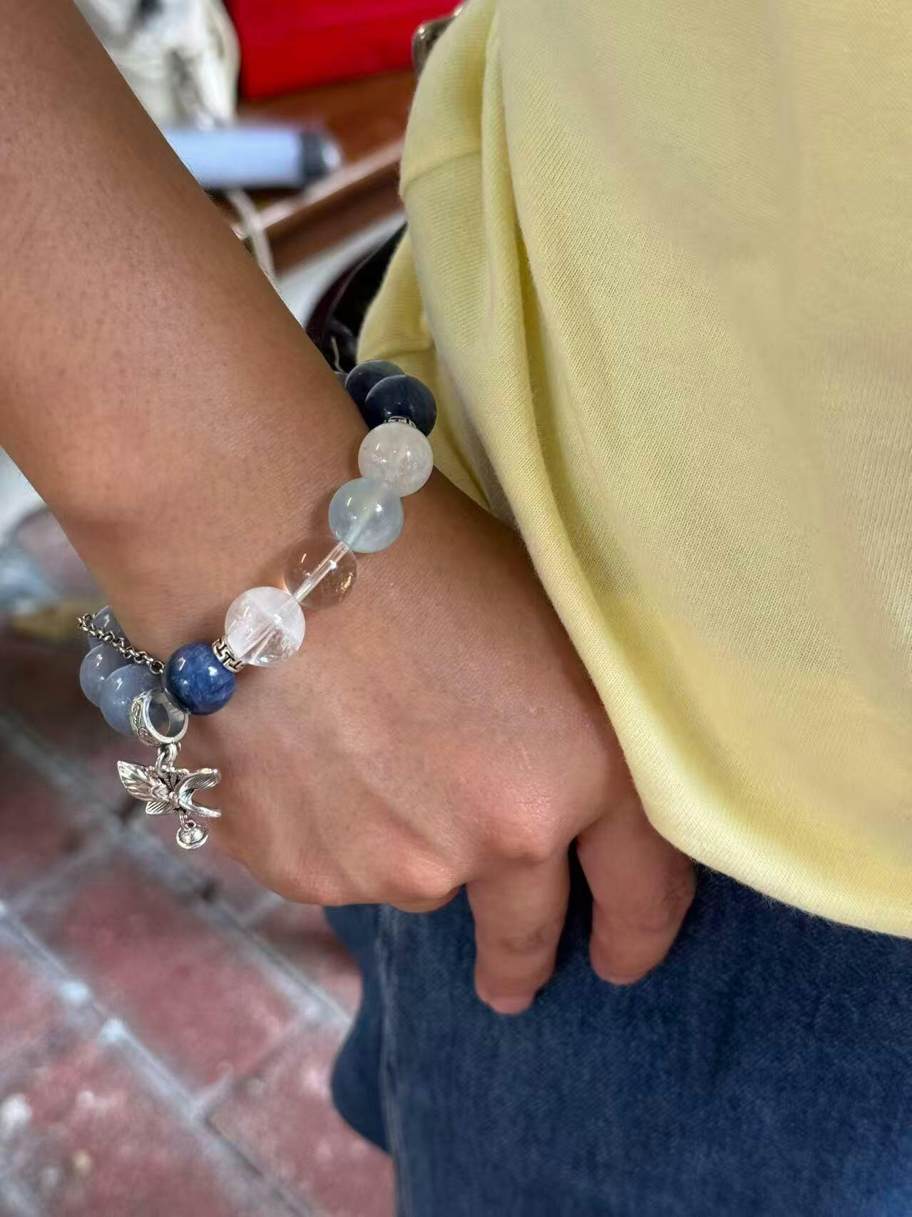 Combining the ocean blue of Aquamarine, the sky blue of Kyanite, the soft blue of Angelite, and the pure transparency of Clear Quartz, creating an angelic accessory that possesses powerful spiritual energy without sacrificing beauty. Like angel wings, symbolizing protection, peace, and spiritual awakening.