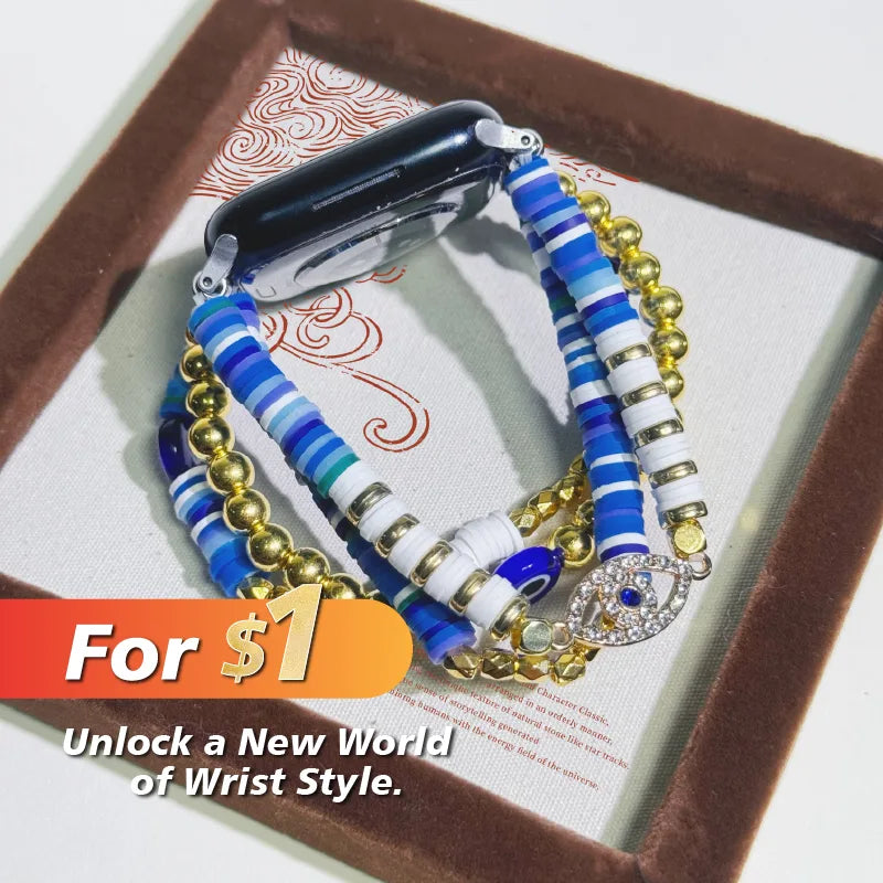 Shield yourself with style through our Evil Eye Beaded Apple Watch Bracelet. This meaningful handcrafted accessory features the iconic evil eye symbol, a timeless talisman revered across cultures for thousands of years, now reimagined to protect and empower you in the digital age.